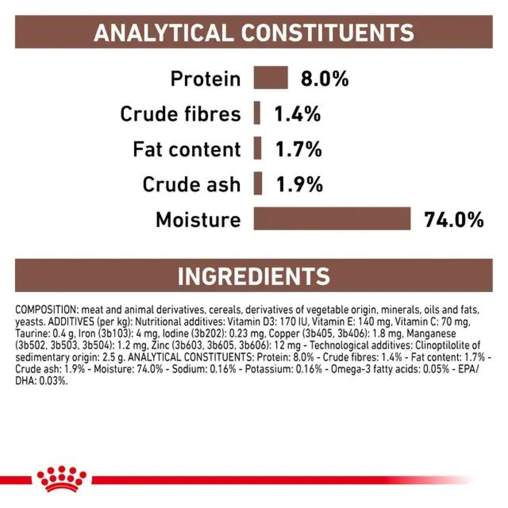 Πρωτεΐνη: 8.0% - Ακατέργαστες διατροφικές ίνες: 1.4% - Ακατέργαστα λίπη: 1.7% - Ανόργανη ύλη: 1.9% - Υγρασία: 74.0% - Νάτριο: 0.16% - Κάλιο 0.16% - Ωμέγα -3 λιπαρά οξέα: 0.05% - EPA/DHA: 0.03%.
