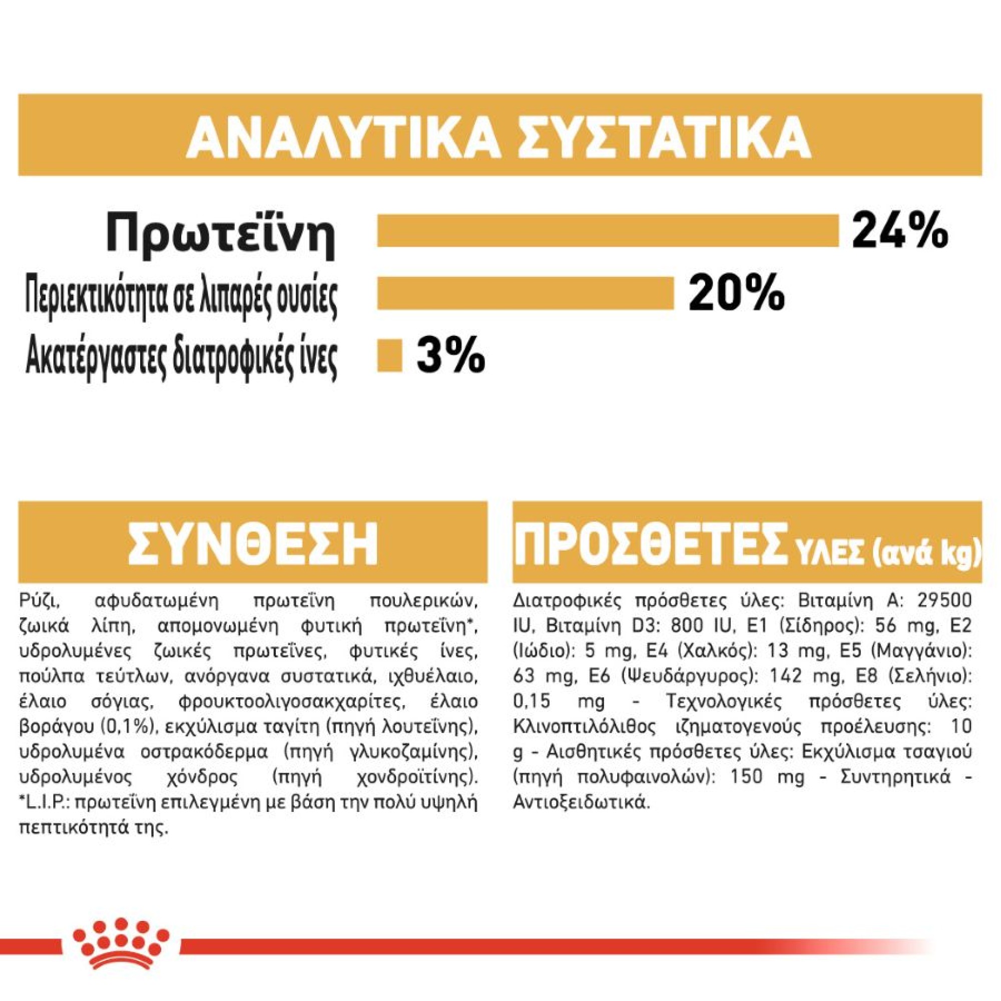 Ρύζι, αφυδατωμένες πρωτεΐνες πουλερικών, ζωικά λίπη, γλουτένη σίτου*, υδρολυμένες ζωικές πρωτεΐνες, φυτικές ίνες, πούλπα τεύτλων, ανόργανα στοιχεία (μεταξύ των οποίων και τριφωσφορικό πεντανάτριο (0,35%)), ιχθυέλαιο, έλαιο σόγιας, φρουκτοολιγοσακχαρίτες, έλαιο βοράγου (0,1%), άλευρο ταγέτη, γλυκοζαμίνη από ζύμωση, υδρολυμένος χόνδρος (πηγή χονδροϊτίνης).