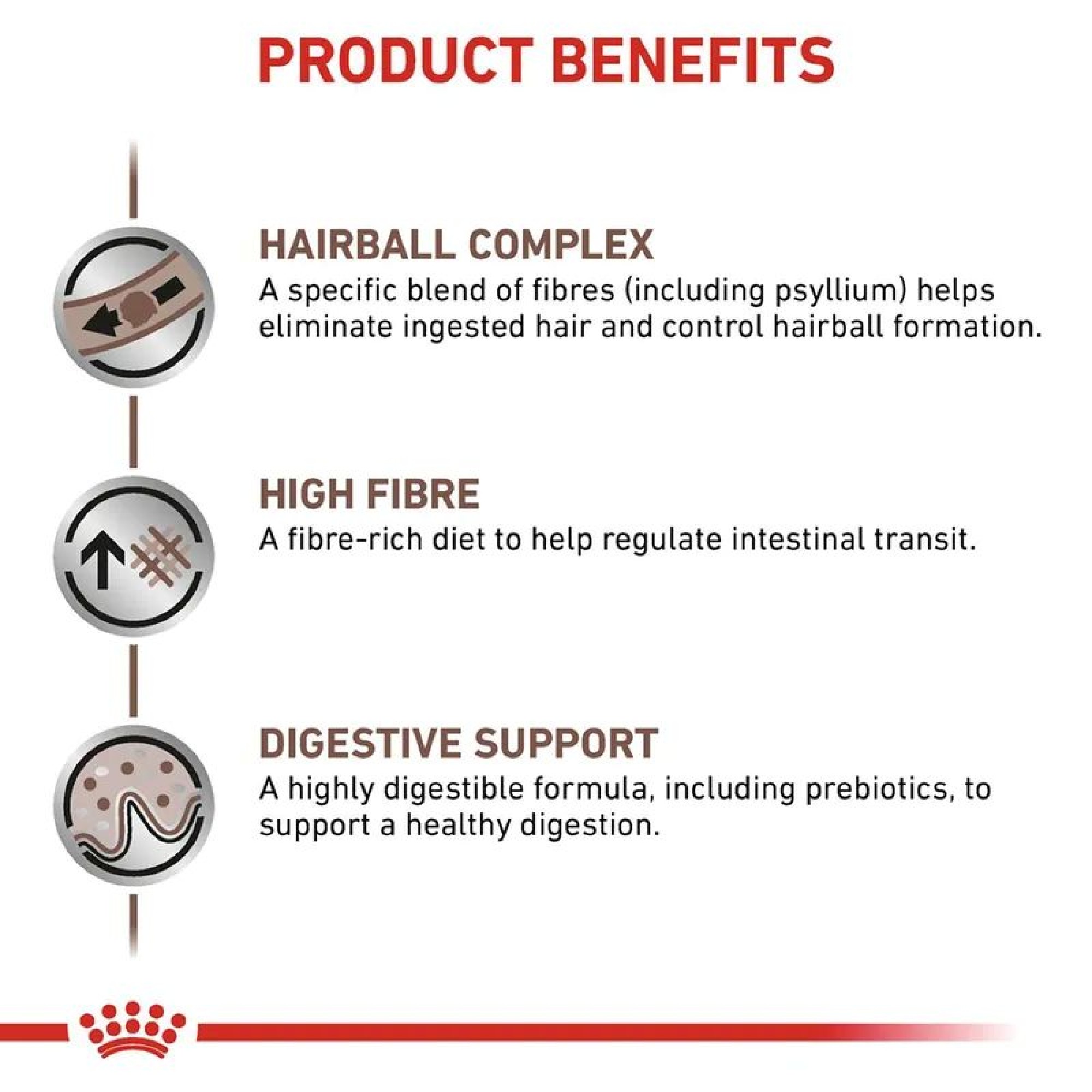 Η Royal Canin Gastrointestinal Hairball αποτελεί μία πλήρης κλινική τροφή με πουλερικά, ειδικά σχεδιασμένη για την υποστήριξη της φυσιολογικής λειτουργίας του εντέρου των ενήλικων γατών. Η τροφή αυτή έχει μέτριο θερμιδικό περιεχόμενο, βοηθώντας στη διατήρηση του ιδανικού βάρους της γάτας. Είναι εύπεπτη και περιέχει ισορροπημένες ίνες καθώς και πρεβιοτικά, τα οποία υποστηρίζουν τη υγιή πέψη και εντερική λειτουργία. Ειδικό μείγμα ινών, συμπεριλαμβανομένου του ψύλλιου, βοηθά στην εξάλειψη των τριχών που καταπίνονται και τον έλεγχο του σχηματισμού τριχόμπαλων.