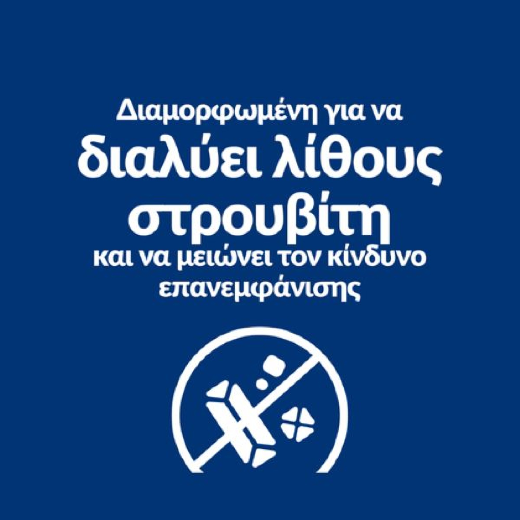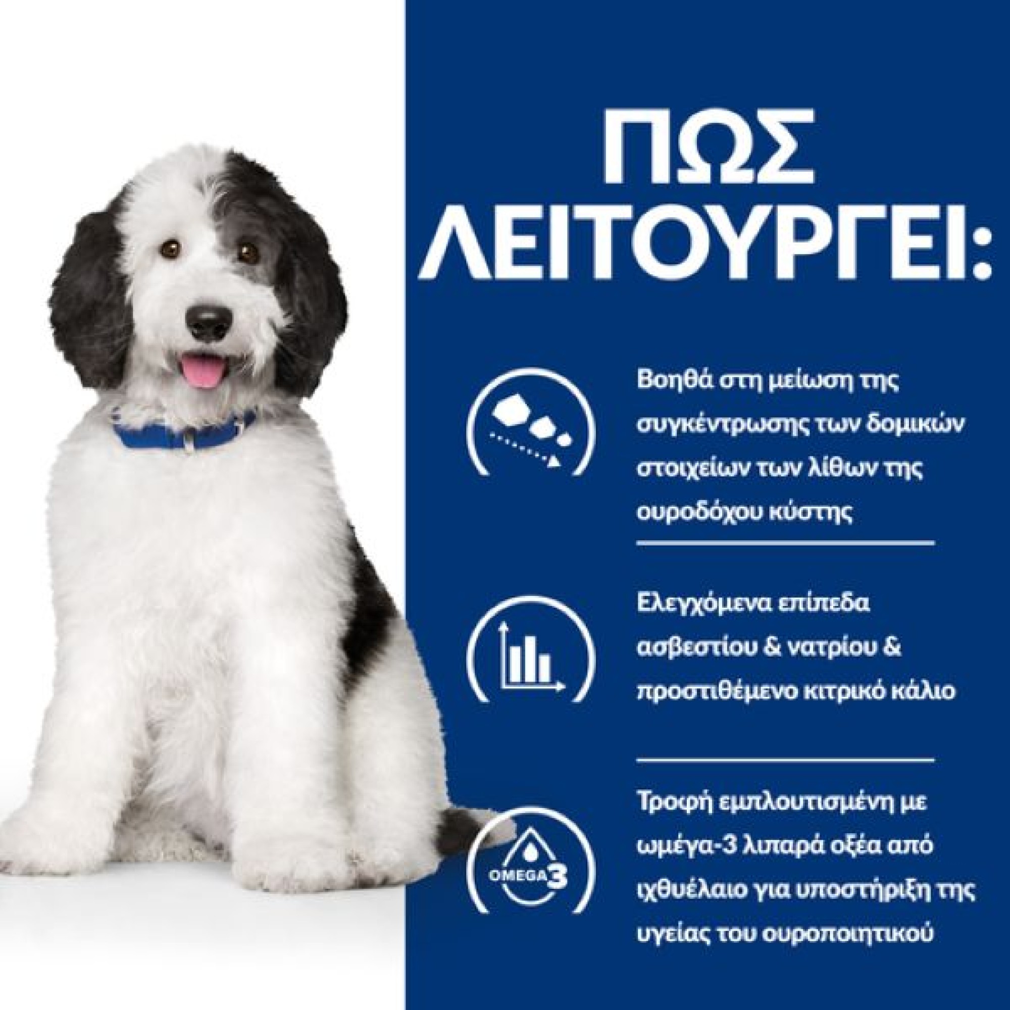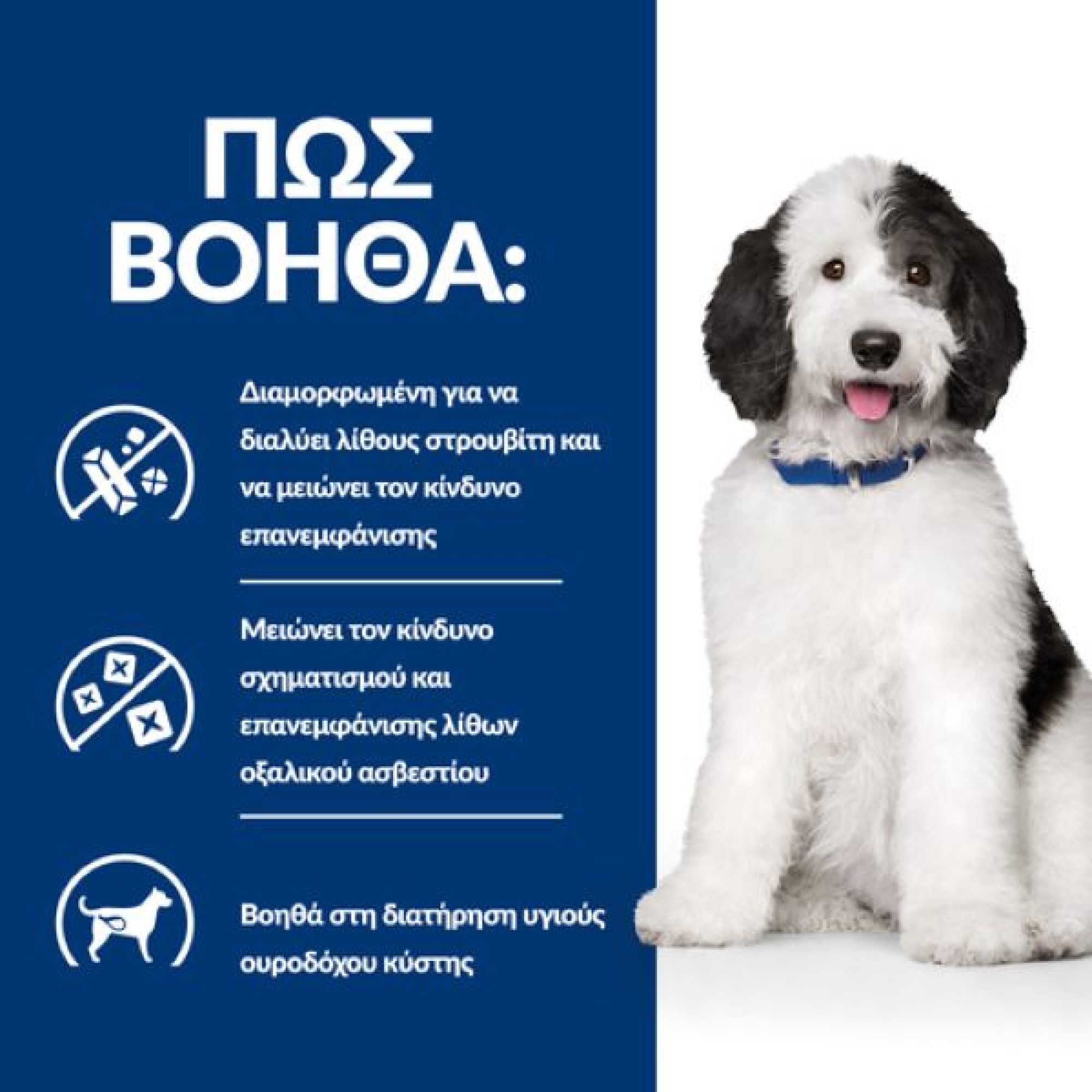 Διατροφολόγοι και κτηνίατροι της Hill's ανέπτυξαν την κλινική διατροφή Prescription Diet c/d Multicare που έχει σύνθεση ειδικά σχεδιασμένη για την υποστήριξη της υγείας του ουροποιητικού των σκύλων και τη μείωση του κινδύνου ουρολίθων στρουβίτη και οξαλικού ασβεστίου. Αυτή η ξηρή τροφή παρασκευάζεται με κοτόπουλο και έχει ακαταμάχητη γεύση που ο σκύλος σας θα λατρέψει.
