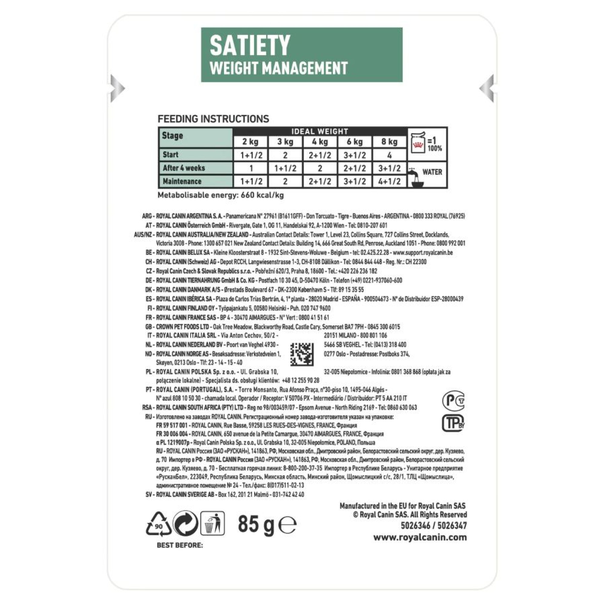 Η Royal Canin Satiety Weight Management Cat αποτελεί μία πλήρης υγρή κλινική τροφή με κομματάκια κρέας σε σάλτσα για ενήλικες και ηλικιωμένες γάτες, σχεδιασμένη για τη διαχείριση του βάρους. Αυτή η κλινική δίαιτα είναι ειδικά διαμορφωμένη για να βοηθά στη μείωση της υπερβολικής πρόσληψης θερμίδων, προάγοντας ταυτόχρονα το αίσθημα κορεσμού. Είναι κατάλληλη για γάτες που χρειάζονται απώλεια βάρους ή διατήρηση του ιδανικού σωματικού τους βάρους.