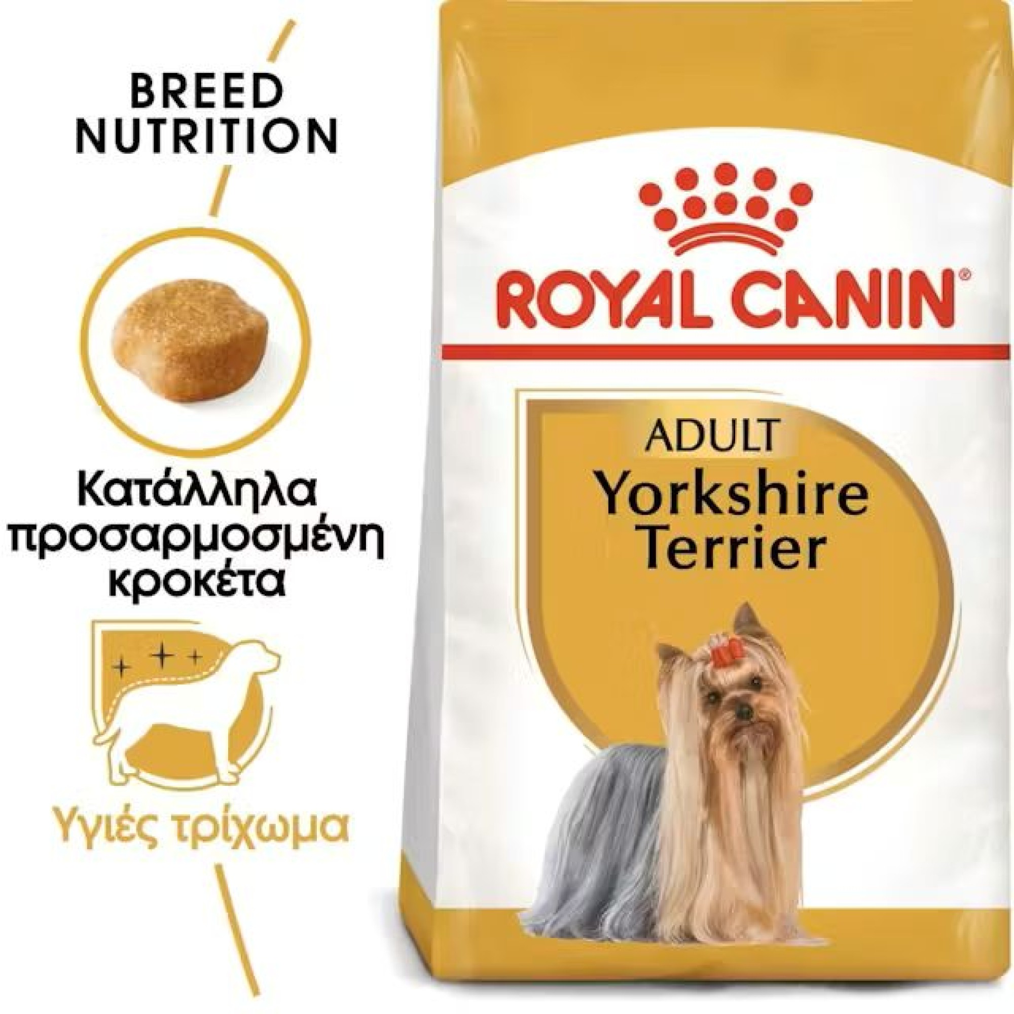Επειδή κάθε φυλή έχει τις δικές της ειδικές απαιτήσεις, η σειρά Breed Health Nutrition της ROYAL CANIN® ικανοποιεί τις διατροφικές ανάγκες των σκύλων διαφορετικών φυλών για να υποστηρίξει τη βέλτιστη υγεία. Για τους σκύλους Yorkshire Terriers ηλικίας άνω των 10 μηνών, ο ROYAL CANIN® Yorkshire Terrier Adult είναι ειδικά σχεδιασμένο τισ ανάγκεσ τους. Περιλαμβάνει για την υποστήριξη του τριχώματος τα λιπαρά ωμέγα-6 λιπαρά οξέα (EPA & DHA), το έλαιο μποράγου και το biotin.Το ROYAL CANIN® Yorkshire Terrier Adult ικανοποιεί ακόμα και τις πιο απαιτητικές ορέξεις, χάρη σε ένα συνδυασμό εξαιρετικών γεύσεων που ο σκύλος σας δεν θα μπορέσει να αντισταθεί! Η καλή στοματική υγιεινή αποτελεί σημαντικό παράγοντα για την επιλογή της τροφής. Το ROYAL CANIN® Yorkshire Terrier Adult βοηθάει στην επιβράδυνση του σχηματισμού πέτρας μέσω της ακριβούς συμπερίληψης των χηλικών συμπλοκών ασβεστίου. Για να ικανοποιήσει τις ατομικές προτιμήσεις κάθε σκύλου, το ROYAL CANIN® Yorkshire Terrier Adult είναι επίσης διαθέσιμο σε υγρή τροφή σε ένα μαλακό και νόστιμο πατέ. Αν σκέφτεστε να κάνετε μεικτή σίτιση, ακολουθήστε απλώς τις οδηγίες μας σχετικά με τη διατροφή του για να διασφαλίσετε ότι ο σκύλος σας λαμβάνει μια ακριβή ποσότητα υγρής και ξηράς τροφής για βέλτιστο όφελος.