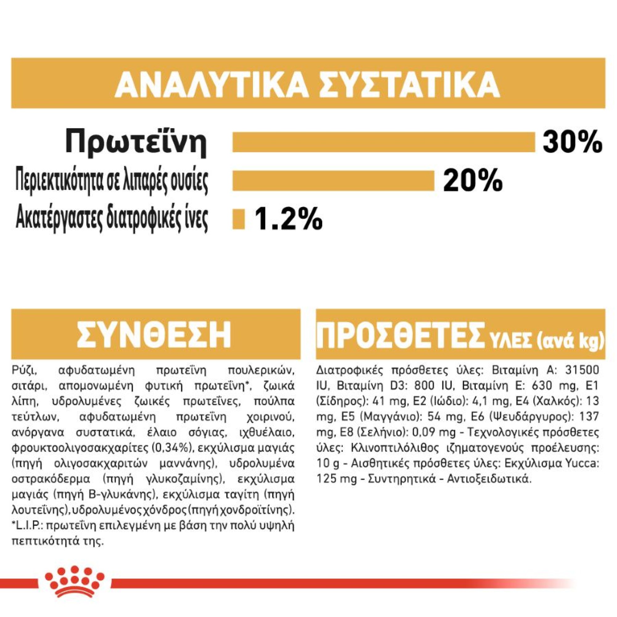 Ρύζι, αφυδατωμένη πρωτεΐνη πουλερικών, σιτάρι, απομονωμένη φυτική πρωτεΐνη*, ζωικά λίπη, υδρολυμένες ζωικές πρωτεΐνες, πούλπα τεύτλων, αφυδατωμένη πρωτεΐνη χοιρινού, ανόργανα συστατικά, έλαιο σόγιας, ιχθυέλαιο, φρουκτοολιγοσακχαρίτες (0,34%), εκχύλισμα μαγιάς (πηγή ολιγοσακχαριτών μαννάνης), υδρολυμένα οστρακόδερμα (πηγή γλυκοζαμίνης), εκχύλισμα μαγιάς (πηγή Β-γλυκάνης), εκχύλισμα ταγίτη (πηγή λουτεΐνης), υδρολυμένος χόνδρος (πηγή χονδροϊτίνης).