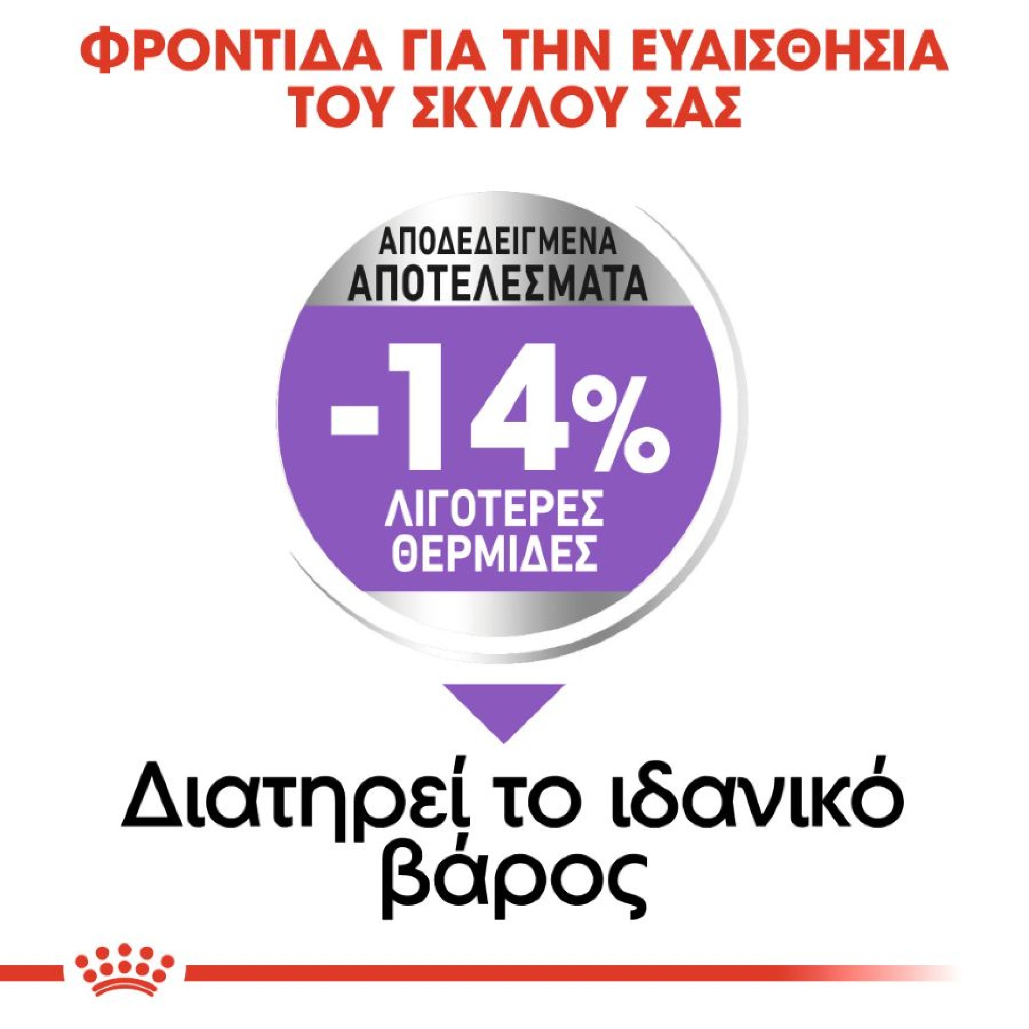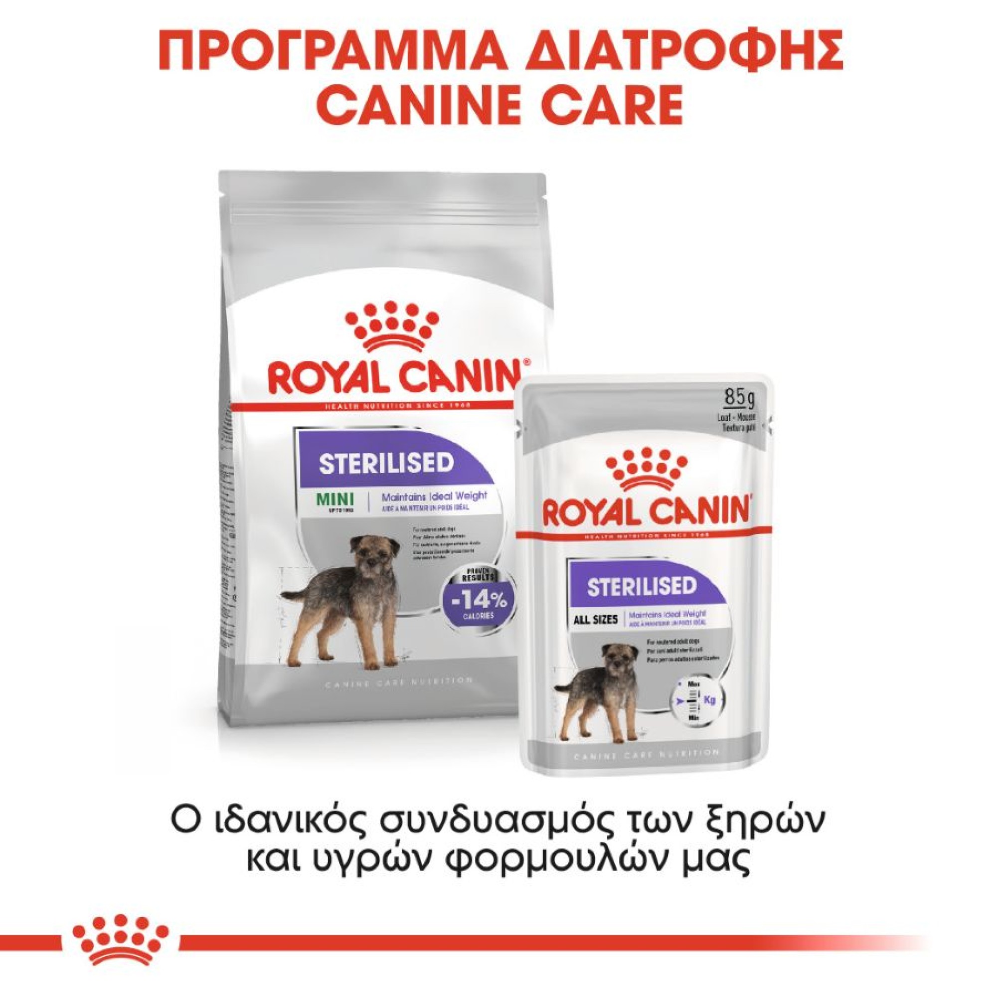 H καλή κατάσταση του σώματος του σκύλου σημαίνει λιγότερους κινδύνους για την υγεία, περισσότερη ζωτικότητα και καλύτερη ποιότητα ζωής. Αλλά μετά από την στείρωση, ο σκύλος σας μπορεί να είναι πιο ευτυχισμένος στον καναπέ από το να περιπλανηθεί, αν και δραστήριος στις ώρες γεύματος. Κατάλληλο για στειρωμένους σκύλους πολύ μικρόσωμων φυλών που ζυγίζουν έως και 10 κιλά, η ROYAL CANIN® Sterilized Mini ικανοποιεί την πείνα του σκύλου σας με όλη την γευστικότητα της υψηλής ποιότητας πλήρους διατροφής - χωρίς την αύξηση του σωματικού βάρους. Η συνταγή του Sterilized Mini είναι πλούσια σε εξαιρετικά εύπεπτες πρωτεΐνες, για να βεβαιωθείτε ότι ο σκύλος σας διατηρεί τη μυϊκή μάζα μειώνοντας ταυτόχρονα την πρόσληψη λίπους και θερμίδων. Ο βέλτιστος συνδυασμός ινών βοηθά τον σκύλο σας να αισθάνεται χορτάτος. Εξασφαλίζει επίσης μια τακτική και υγιή εντερική διάβαση, καθώς και καλύτερη πέψη. Επιπλέον, οι διαιτητικές ίνες ικανοποιούν την πείνα του σκύλου σας και βοηθούν να μειωθεί η αναζήτηση τροφής ενδιάμεσα των γευμάτων. Για να βοηθήσετε τον σκύλο σας να αποφύγει τις επιπλοκές της υγείας που συνοδεύουν τα επιπλέον κιλά, αυτή η φόρμουλα είναι σχεδιασμένη με λιγότερο λίπος. Η ROYAL CANIN® Sterilized Mini δοκιμάζεται και αποδεικνύεται επιστημονικά ότι είναι 14% χαμηλότερη σε θερμίδες από μία κανονική τροφή για ενήλικους σκύλους. Αυτό σημαίνει ότι τα αποτελέσματα της ROYAL CANIN® Sterilized Mini είναι αποδεδειγμένα επιτυχημένα. Το πρόγραμμα διατροφής για στειρωμένους σκύλους διατίθεται και σε τραγανές κροκέτες και σε ένα νόστιμο πατέ σε φακελάκι. Γιατί να μην δοκιμάσετε το πατέ ως μια υπέροχη επικάλυψη στις κροκέτες;