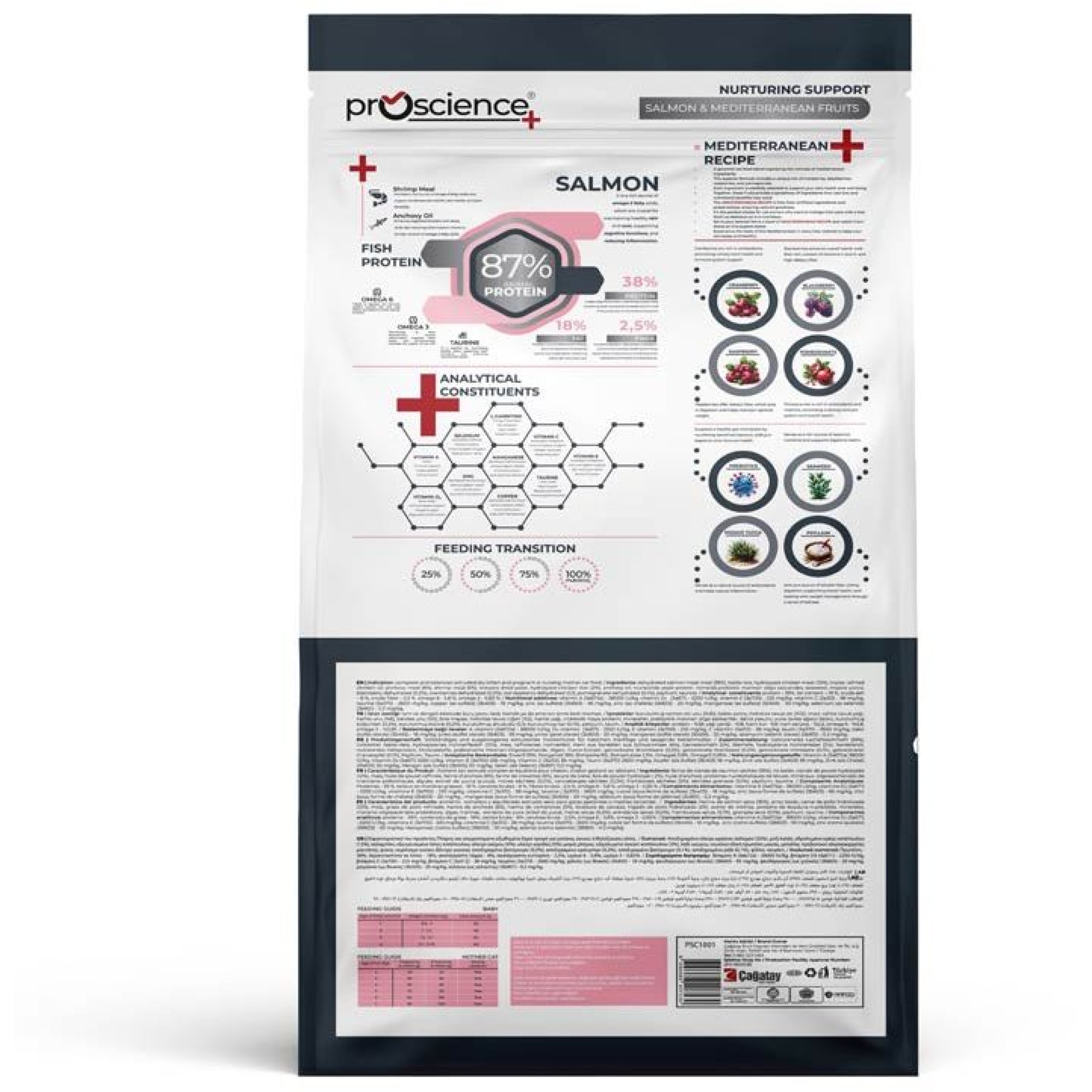Περιέχει σολομό και μεσογειακά φρούτα, και έχει σχεδιαστεί για να καλύπτει τις συγκεκριμένες διατροφικές ανάγκες των γατών και των μητέρων γατών.