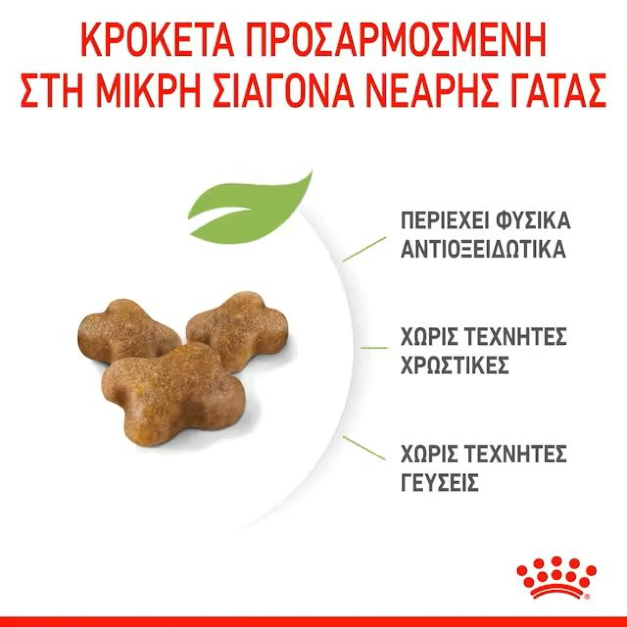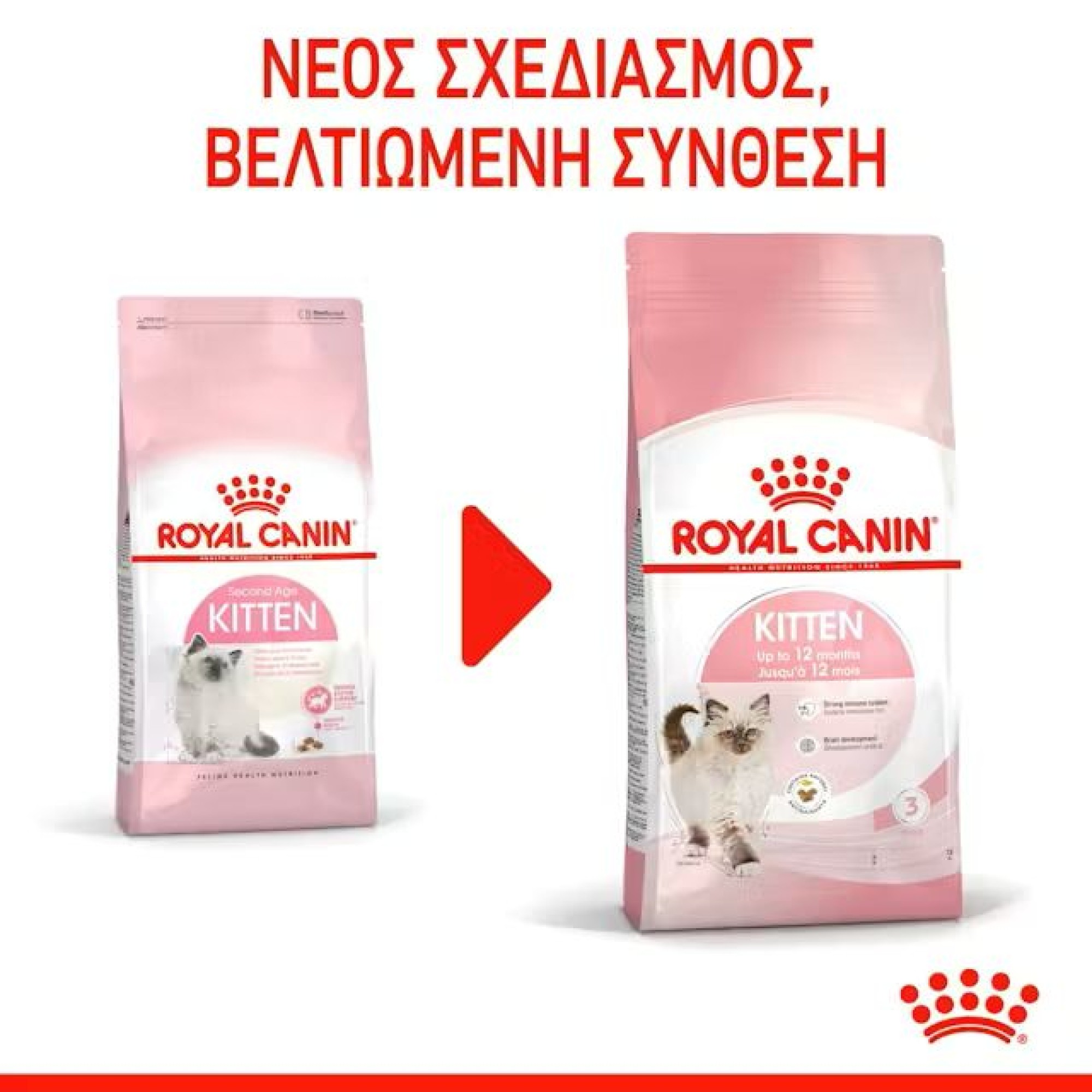 Η ROYAL CANIN® Kitten είναι ειδικά σχεδιασμένη για να υποστηρίζει τις διατροφικές ανάγκες των νεαρών γατών στη «φάση εδραίωσης» της ανάπτυξής τους. Αυτή η φόρμουλα είναι κατάλληλη για νεαρές γάτες από 4 έως 12 μηνών, καθώς υφίστανται μια περίοδο σημαντικών σωματικών και συμπεριφορικών αλλαγών. Αυτή η προσαρμοσμένη δίαιτα περιέχει προσαρμοσμένα επίπεδα πρωτεϊνών, ανόργανων στοιχείων και βιταμινών για να ικανοποιήσει τα αυξανόμενα επίπεδα ενέργειας της γάτας σας και να υποστηρίξει την ανάπτυξη των οστών και των μυών. Περιέχει επίσης θρεπτικά συστατικά όπως βιταμίνη C και Ε για να υποστηρίξει την ανάπτυξη του υγιούς ανοσοποιητικού συστήματος της νεαρής γάτας. Αυτά τα διατροφικά αντιοξειδωτικά έχει αποδειχθεί ότι διεγείρουν υψηλότερη και ταχύτερη αύξηση των αντισωμάτων μετά τον εμβολιασμό. Το ROYAL CANIN® Kitten είναι επίσης εμπλουτισμένο με Ωμέγα-3 λιπαρά οξέα (DHA) για την υποστήριξη της ανάπτυξης του εγκεφάλου και την ενίσχυση της υγιούς όρασης. Χάρη σε έναν συνδυασμό ωφέλιμων πρεβιοτικών (MOS) και εξαιρετικά εύπεπτων πρωτεϊνών, το ROYAL CANIN® Kitten βοηθά επίσης στην υποστήριξη της υγιούς ισορροπίας της εντερικής μικροχλωρίδας (χλωρίδα του εντέρου) για καλή πέψη. Η κροκέτα ROYAL CANIN® Kitten έχει επίσης σχεδιαστεί ειδικά για το μικρο στόμα της νεαρής γάτας σας. Ένα μηχανικό αποτέλεσμα βουρτσίσματος βοηθά στην υποστήριξη της οδοντικής υγείας, καθώς η νεαρή γάτα σας μασάει την τροφή της.Όταν η νεαρή γάτα σας φτάσει τους 12 μήνες, θα χρειαστεί μια δίαιτα που είναι ειδικά προσαρμοσμένη για να καλύψει τις διατροφικές της ανάγκες ως ενήλικη γάτα. Σε αυτό το στάδιο, μπορείτε να τη βοηθήσετε να μεταβεί στη σειρά τροφών ROYAL CANIN® για ενήλικες γάτες, που διατίθεται ως ξηρή ή υγρή τροφή σε σάλτσα, ζελέ ή υφή πατέ.
