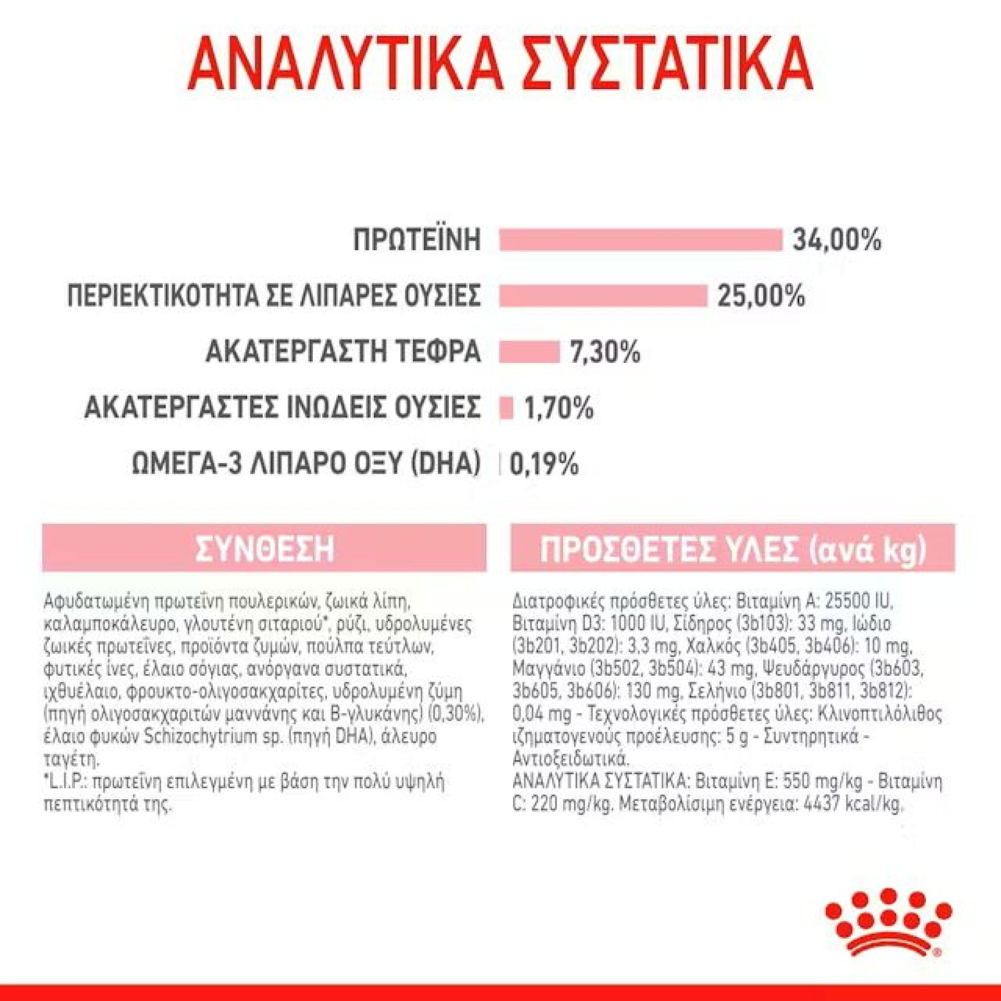 Ακατέργαστη Πρωτεϊνη 34%, Λίπος 25%, Ακατέργαστη Τέφρα 6.7%, Ακατέργαστες Φυτικές Ίνες 1.9%, Πρόσθετα